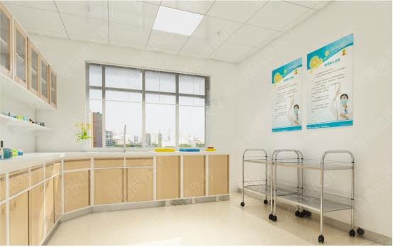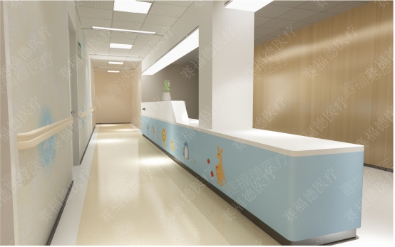 病房護(hù)士站結(jié)合各科室的特點(diǎn)及病房的整體裝修風(fēng)格進(jìn)行設(shè)計(jì),如兒科病房,配置淡藍(lán)色為主色調(diào),在增加卡通貼畫,使其富有童趣,邊角采用圓角處理,避免磕碰