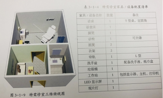 診查區(qū):設(shè)置T型桌、醫(yī)生工作站、醫(yī)生及患者座椅、洗手盆等醫(yī)用家具。醫(yī)生在此區(qū)域完成問診及初步檢查。