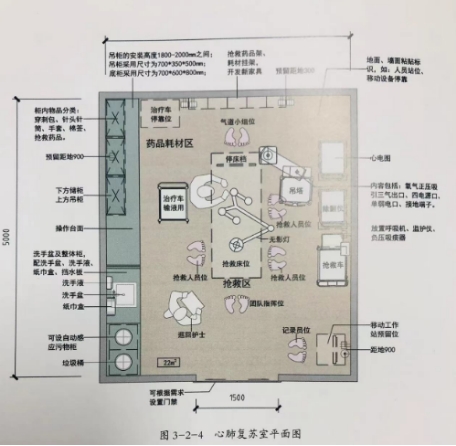 心肺復(fù)蘇室也稱搶救室,是急診用房,一般設(shè)置在急診樓一層,靠近搶救大廳,用于對各種原因引起的心跳驟停實施救護和操作,以保護心、腦等重要器官。醫(yī)院心肺復(fù)蘇室醫(yī)用家具的配置,房間內(nèi)配置呼吸機、除顫儀、心電圖機等急救設(shè)備及各種搶救藥品、物品。搶救室應(yīng)直通門廳,面積不應(yīng)小于每床 30m°。如圖 3-2-4、圖3-2-5 所示。