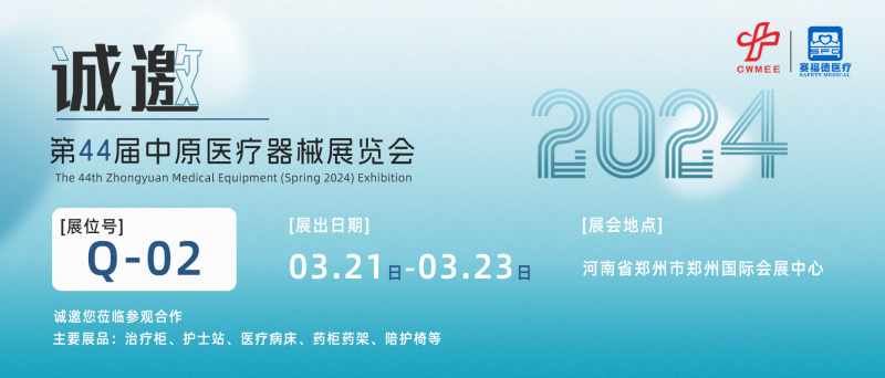 河南賽福德醫(yī)療將參加第44屆中原醫(yī)療器械(2024年春季)展覽會(huì) 展出日期:2024年3月21-23日 展會(huì)地點(diǎn):河南省鄭州市鄭州國(guó)際會(huì)展中心 展位號(hào):Q02 主要展品:治療柜、護(hù)士站、醫(yī)療病床、藥柜藥架、陪護(hù)椅等