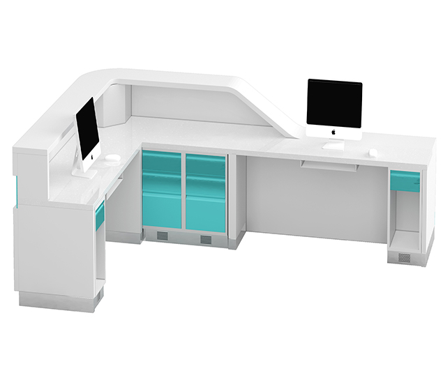 介紹:L型護士站工作臺適用于住院部區(qū)域,主要是醫(yī)護人員日?;颊哒樟希Y料建檔存放、與病患家屬溝通等,在設計上根據(jù)各科室的特色設計不同色彩的護士站,例外科,主要以白色為主,配藍色線條進行裝飾,婦幼護士站以粉色系為主,通過不同的色彩搭配來區(qū)分各個科室,給患者帶來不同的就醫(yī)環(huán)境及體驗,另要考慮其安全性,功能性,我們在安全上注重圓角邊角的處理,避免造成不必要的傷害。