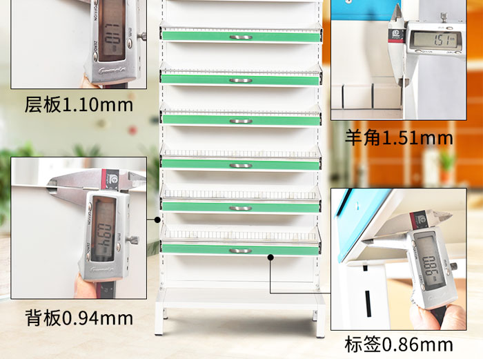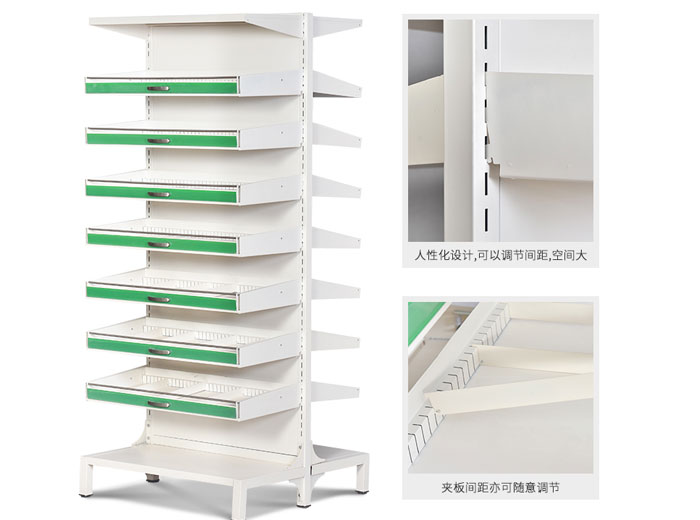 1. 主架,頂板2塊,托板8塊,底板2塊,托板及底板均可以擺放物品,可實(shí)用面積大,擺放藥品清晰明了;可90度平掛,也可以70到90度之間斜掛,每層托板層距可根據(jù)實(shí)際隨意調(diào)節(jié)。