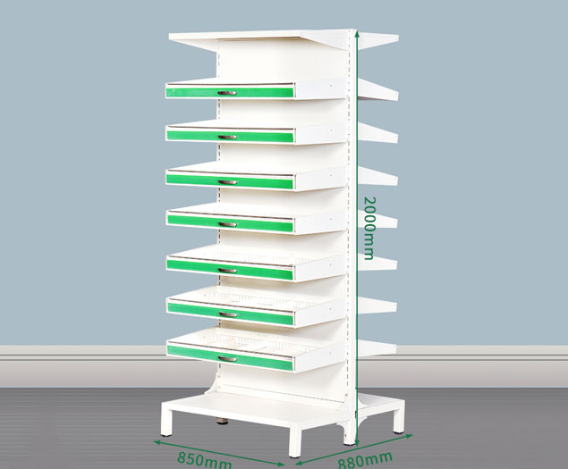 1.主架,頂板2塊,托板8塊,底板2塊,托板及底板均可以擺放物品,可實(shí)用面積大,擺放藥品清晰明了;可90度平掛,也可以70到90度之間斜掛,每層托板層距可根據(jù)實(shí)際隨意調(diào)節(jié)。